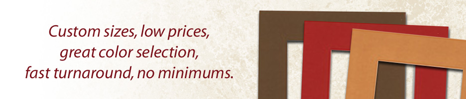 At Milburn we pride ourselves on offering only the highest quality products, and our pre-cut mats are no exception. We use only white-core mats with our trade marked “White Core Accents“. It is a superior matboard which will maintain a crisp, white bevel. Discoloration and fading are a thing of the past with our “Stable Color” surface papers, and with a 100% acid-free core and backing you can always trust your memories to us. All mats are individually packaged in a re-sealable clear view bag for easy display.